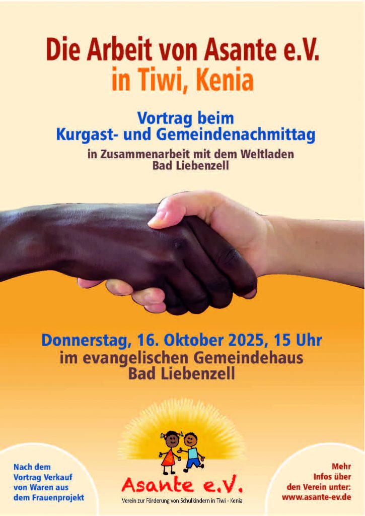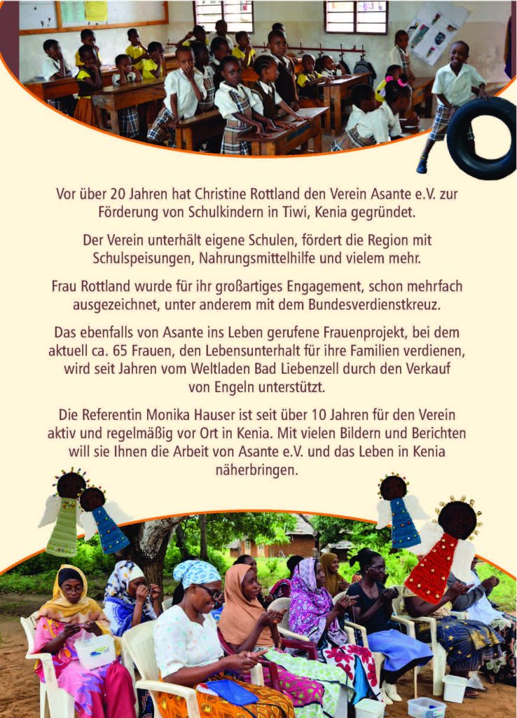 Vortrag in Zusammenarbeit mit dem Weltladen Bad Liebenzell, der seit Jahren Engel aus dem Frauenprojekt verkauft. Monika Hauser berichtet über die Arbeit von Asante in Kenia. Mit frischen Eindrücken, Bildern und Filmen von ihrem Besuch im Juli bis September dieses Jahres.